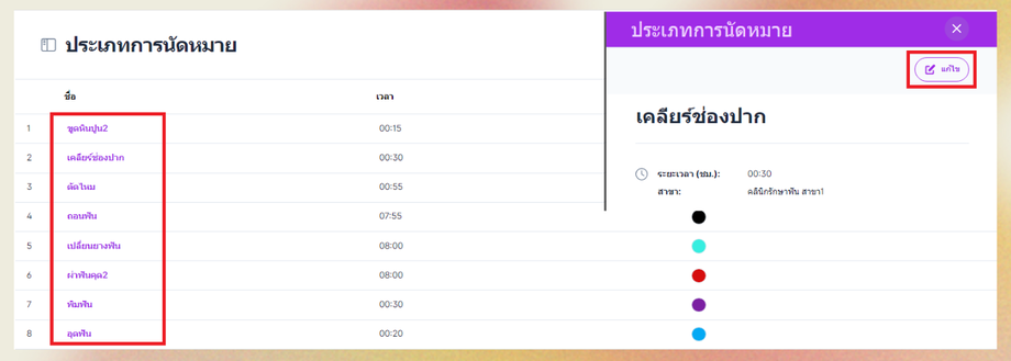 เมื่อผู้ใช้อยู่ในหน้าประเภทการนัดหมาย เลือกการนัดหมายที่ต้องการแก้ไขจะมีหน้าต่างแสดงข้อมูลขึ้นมา > แก้ไข