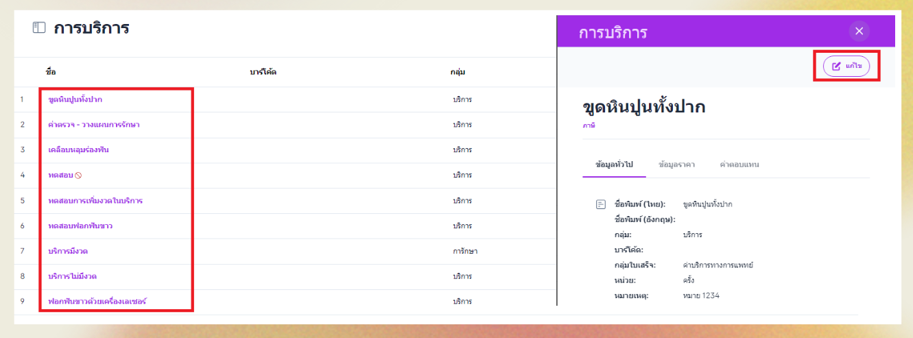 เมื่อผู้ใช้อยู่ในหน้าการบริการเลือกการบริการที่ต้องการแก้ไขจะมีหน้าต่างข้อมูลการบริการแสดงขึ้นมา > แก้ไข