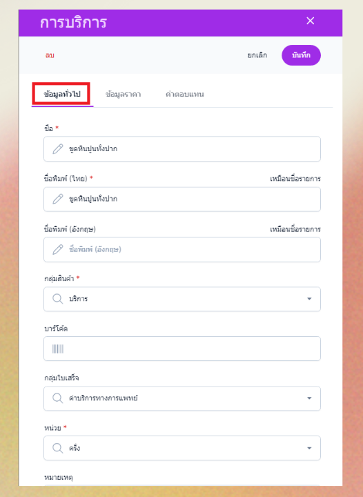 - ชื่อพิมพ์ไทย : ชื่อรายการบริการที่จะแสดงในการพิมพ์ ภาษาไทย