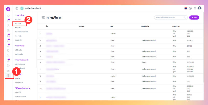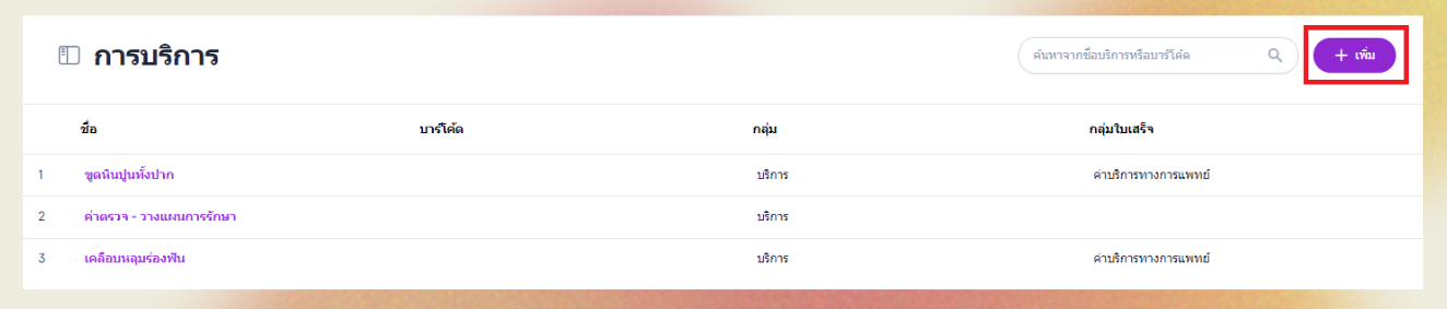 - ประเภท : ระบุประเภทรายการบริการ ได้แก่ การรักษา, การบริการ, ยา และ สินค้า