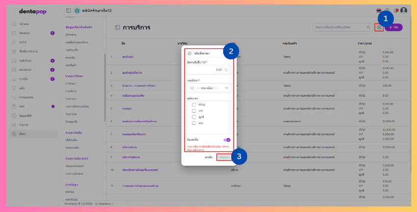 สามารถแก้ไขราคารายการบริการได้ทั้งหมดทุกรายการ โดยอัตราปรับขึ้นเป็น %