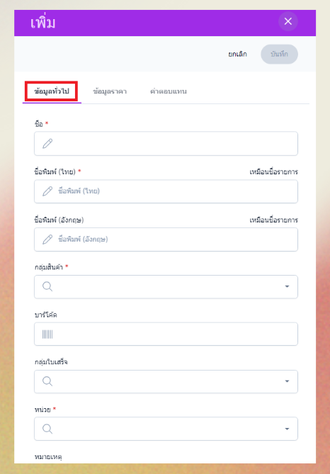 - บาร์โค้ด : รหัสบาร์โค้ดเพื่อใช้กับเครื่องอ่านบาร์โค้ด