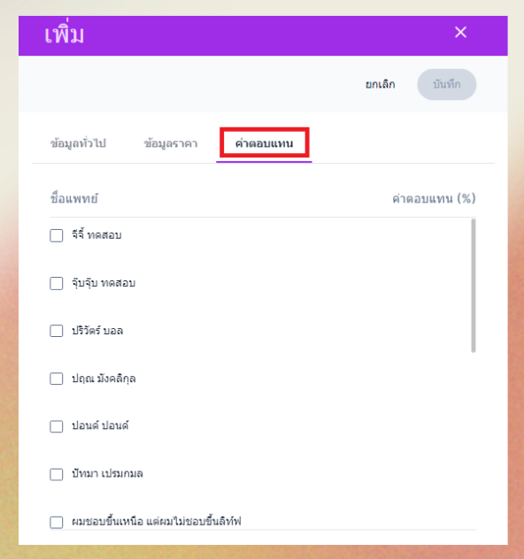 เมื่อกำหนดค่าตอบแทนแพทย์ ในขั้นตอนการสั่งรายการจะสามารถเลือกแพทย์เพื่อรับค่าตอบแทนตาม % ที่ทำการตั้งค่าไว้ได้