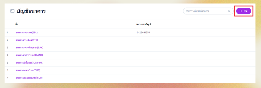 เมื่อผู้ใช้เข้าสู่หน้าบัญชีธนาคารคลิกที่เพิ่ม
