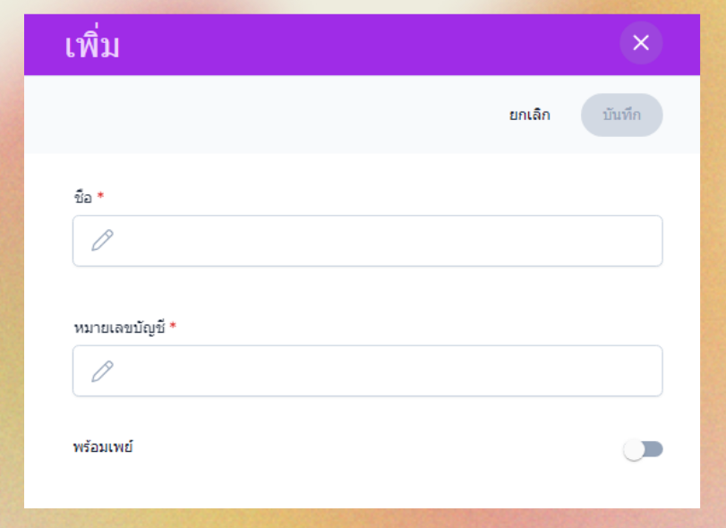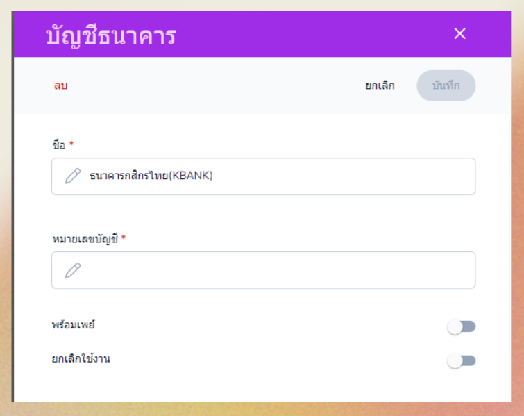 ระบบจะแสดงหน้าต่างเพิ่มบัญชีธนาคารขึ้นมา กรุณากรอกข้อมูลให้ครบถ้วน