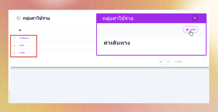 คลิกที่รายการที่ต้องการแก้ไข ระบบจะแสดงหน้าต่างรายการกลุ่มค่าใช้จ่าย จากนั้นคลิกแก้ไข