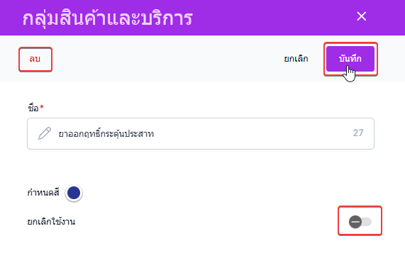 เมื่อตั้งค่าเสร็จสิ้น คลิกปุ่ม บันทึก ระบบจะบันทึกการแก้ไขกลุ่มสินค้าและบริการของรายการที่ผู้ใช้งานเลือก