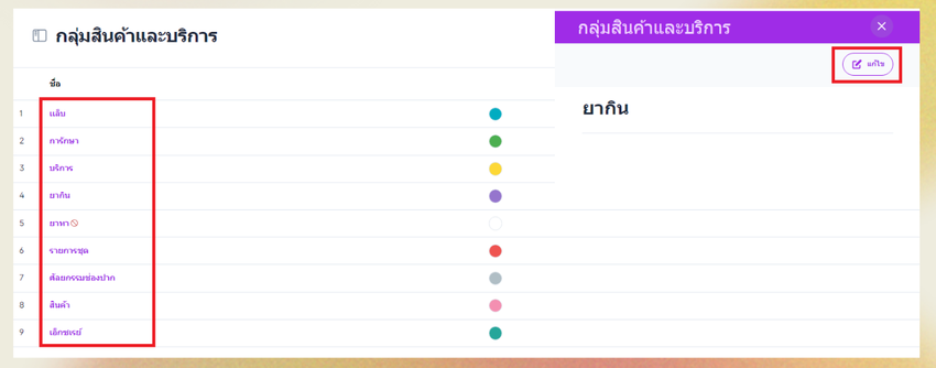 เมื่อผู้ใช้อยู่ในหน้ากลุ่มสินค้าและบริการ เลือกกลุ่มสินค้าและบริการที่ต้องการแก้ไขจะมีหน้าต่างแสดงข้อมูลขึ้นมา คลิกแก้ไข