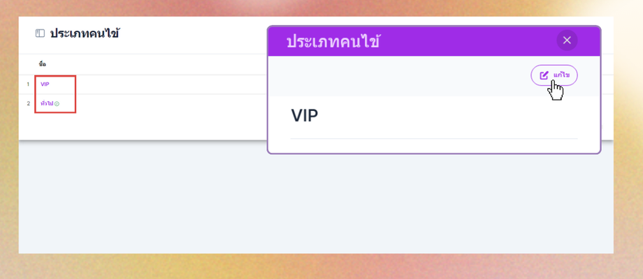 เมื่อผู้ใช้อยู่ในหน้าประเภทคนไข้ เลือกประเภทคนไข้ที่ต้องการแก้ไขจะมีหน้าต่างแสดงข้อมูลขึ้นมา > แก้ไข