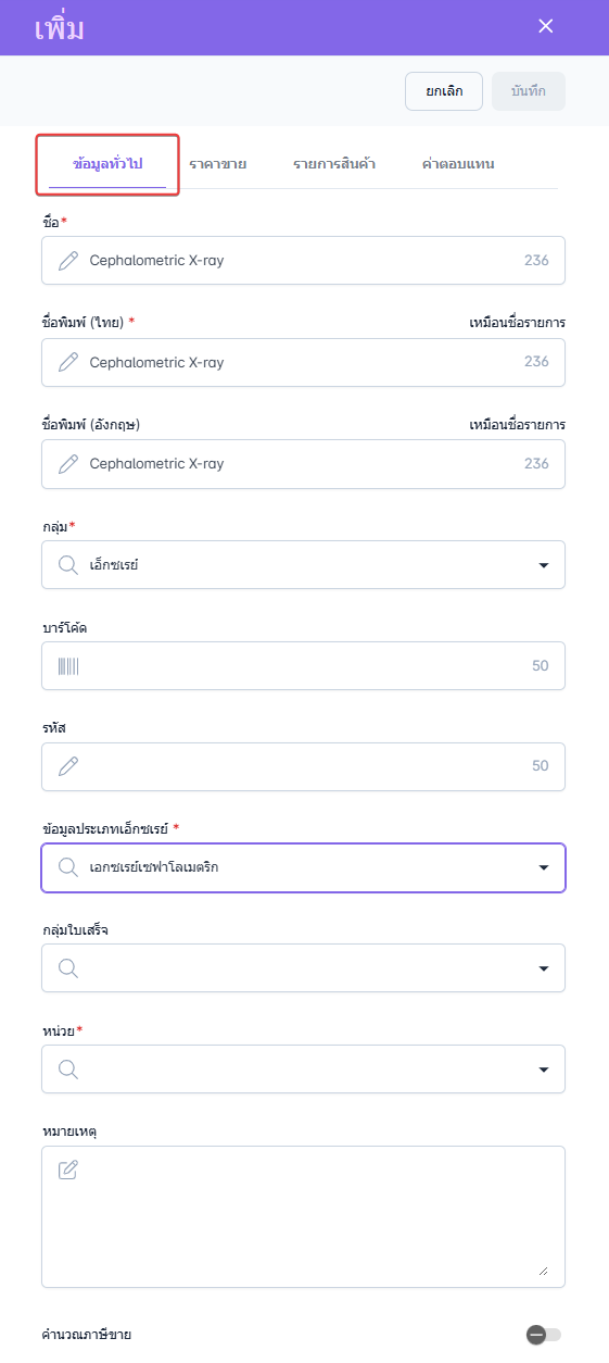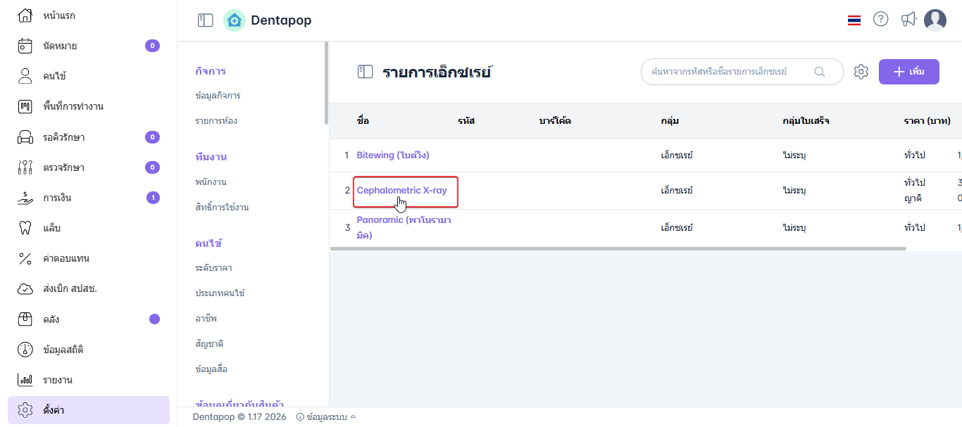 การตั้งค่ารายการเอ็กซเรย์เป็นการบันทึกข้อมูลรายละเอียดของแต่ละรายการ เช่น ชื่อรายการ ราคา ค่าตอบแทน และรายการสินค้าเสริมที่เกี่ยวข้อง โดยข้อมูลดังกล่าวจะถูกนำไปใช้งานในส่วนหลักของขั้นตอนการสั่งรายการ เพื่อให้การทำงานเป็นไปอย่างถูกต้อง ครบถ้วน และมีประสิทธิภาพ