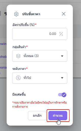 เมื่อกรอกข้อมูลตามที่ต้องการเสร็จสิ้น คลิก คำนวณ ระบบจะบันทึกการปรับราคา