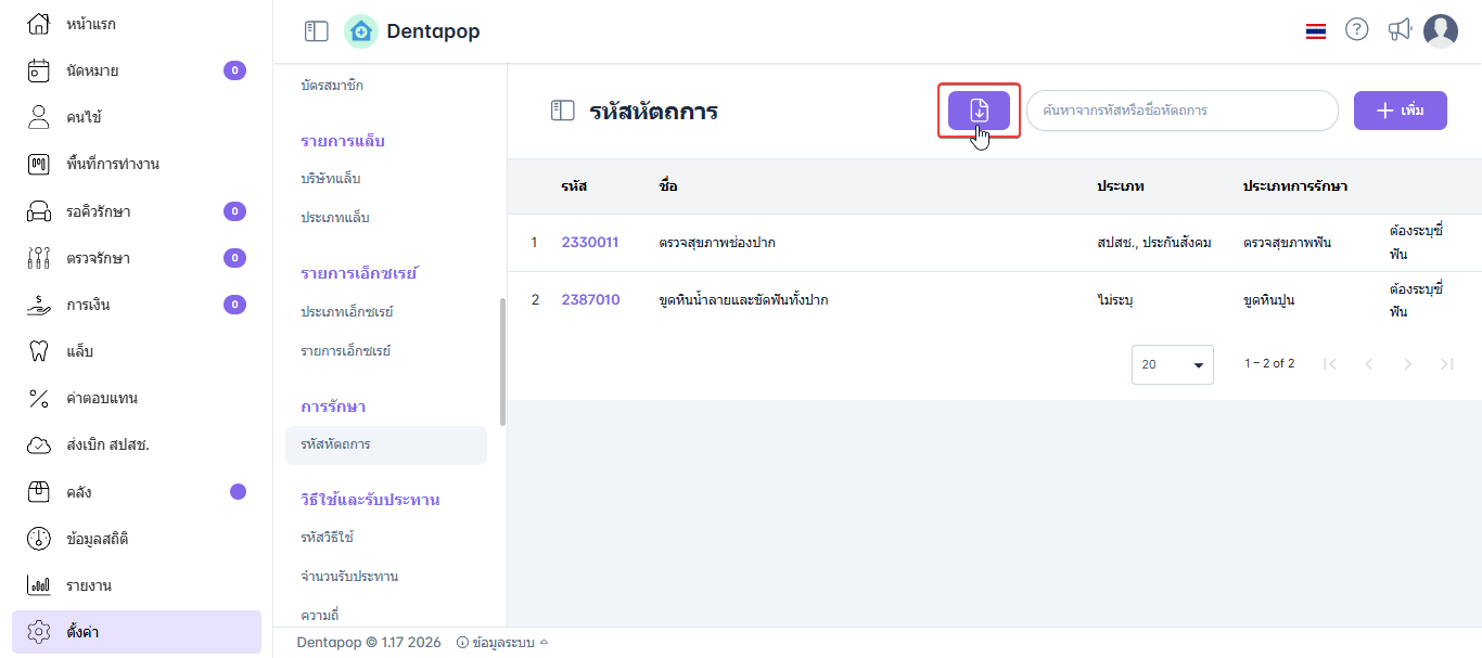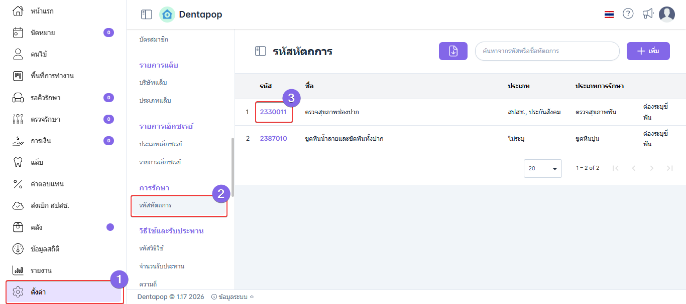 การตั้งค่ารหัสหัตถการ คือการกำหนดรหัสและรายละเอียดของหัตถการทางทันตกรรม เพื่อใช้ในการบันทึกข้อมูลการรักษาภายในระบบ เมื่อผู้ใช้งานทำการเพิ่มข้อมูลหัตถการให้กับผู้ป่วย ระบบจะแสดงรายการรหัสหัตถการที่ได้ตั้งค่าไว้ เพื่อให้สามารถเลือกและบันทึกข้อมูลการรักษาได้อย่างถูกต้อง รวดเร็ว และเป็นมาตรฐานเดียวกันภายในคลินิกการเพิ่มรหัสหัตถการ