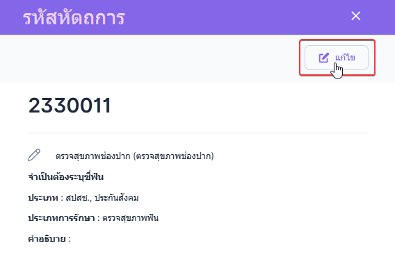 ผู้ใช้งานคลิกปุ่ม แก้ไข เพื่อเปิดหน้าต่างการตั้งค่าแก้ไขรหัสหัตถการ