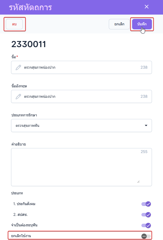 เมื่อตั้งค่าเสร็จสิ้น คลิกปุ่ม บันทึก ระบบจะบันทึกการแก้ไขรหัสหัตถการของรายการที่ผู้ใช้งานเลือก