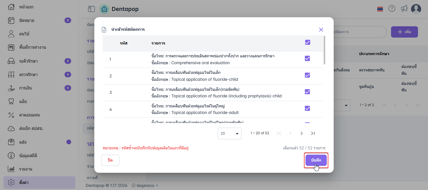 ผู้ใช้งานสามารถเลือกนำเข้ารหัสหัตถการได้แบบรายตัวหรือนำเข้าทั้งหมดได้ หลังจากนั้นคลิก บันทึก ระบบจะนำเข้ารหัสหัตถการที่ผู้ใช้งานเหลือเข้าสู่ระบบ