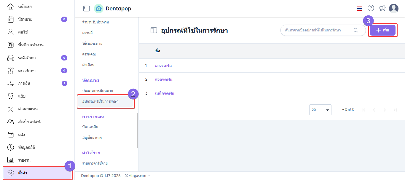เมื่อผู้ใช้อยู่ในหน้าอุปกรณ์ที่ใช้ในการรักษา คลิกปุ่มเพิ่ม
