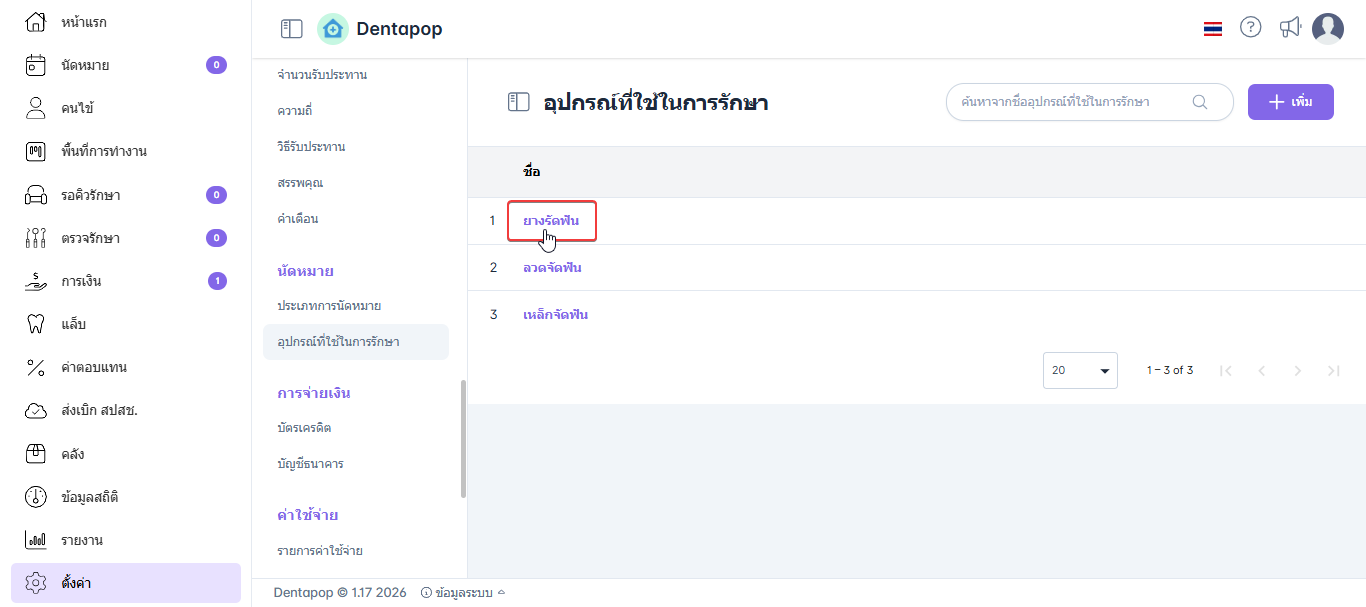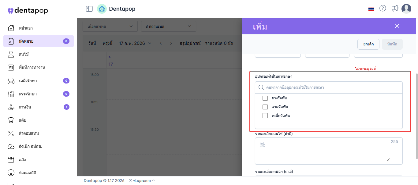 รายการอุปกรณ์ที่ตั้งค่าไว้ สามารถเลือกใช้งานได้ในขั้นตอนการสร้างหรือแก้ไขนัดหมาย เพื่อระบุอุปกรณ์ที่ต้องใช้สำหรับการรักษาในนัดนั้น ๆ การระบุอุปกรณ์ล่วงหน้าช่วยให้ทีมงานสามารถเตรียมความพร้อมได้อย่างเหมาะสม และช่วยให้การให้บริการเป็นไปอย่างราบรื่นและมีประสิทธิภาพ