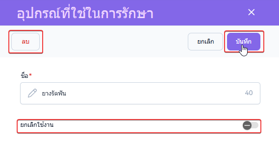 การยกเลิกใช้งาน : คือรายการจะยังอยู่ในระบบแต่แสดงสถานะยกเลิก