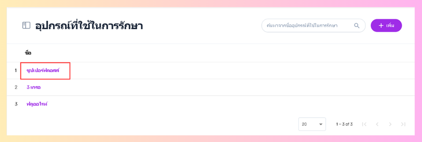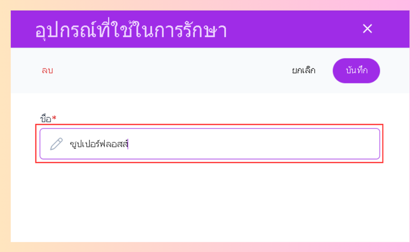 - ผู้ใช้งานจะเข้าสู่หน้าเพิ่มรายการ กรอกชื่ออุปกรณ์การรักษา จากนั้นกดบันทึก