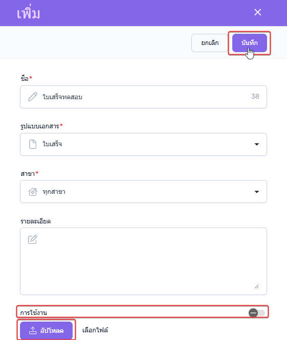 ผู้ใช้งานสามารถกรอกข้อมูลเพื่อทำการเพิ่อรูปแบบเอกสารได้ดังนี้