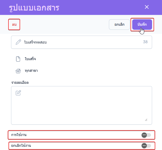 การใช้งาน : เปิด/ปิดการใช้งาน หากปิดการใช้งานระบบจะไม่สามารถพิมพ์รูปแบบเอกสารนี้ได้