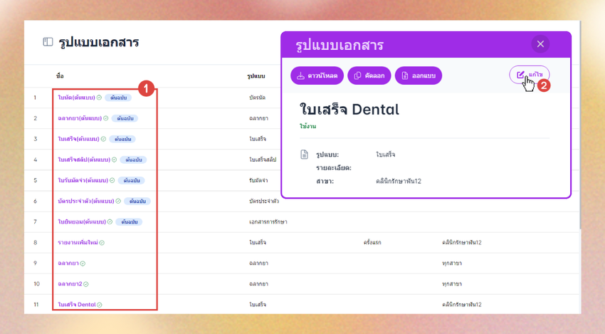 เมื่อผู้ใช้งานเข้าถึงหน้าการตั้งค่ารูปแบบเอกสารแล้ว ให้เลือกรูปแบบเอกสารที่ต้องการแก้ไขข้อมูล จะมีหน้าต่างรูปแบบเอกสารแสดงขึ้นมาจากนั้นกดแก้ไข