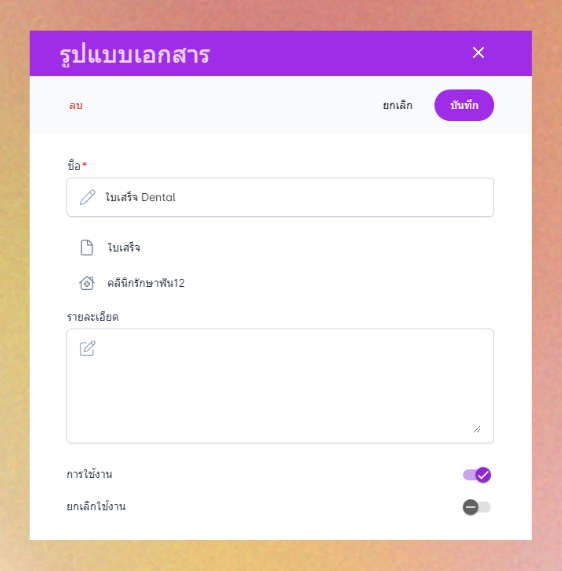 - การใช้งาน : เปิด/ปิดการใช้งาน หากปิดการใช้งานระบบจะไม่สามารถพิมพ์รูปแบบเอกสารนี้ได้