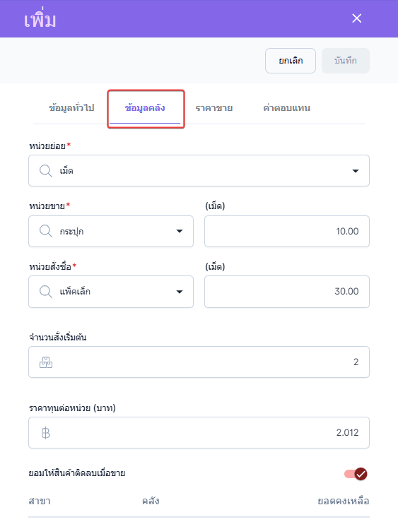 ผู้ใช้งานสามารถตั้งค่าจำนวนการขายเริ่มต้นได้และระบุราคาทุนต่อหน่วย