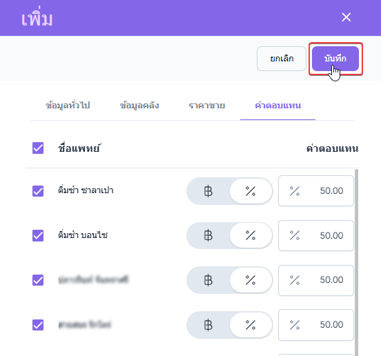 ผู้ใช้งานสามารถตั้งค่าตอบแทนแพทย์โดยคิดเป็นจำนวนเงิน(บาท)หรือเป็นเปอร์เซ็นได้
