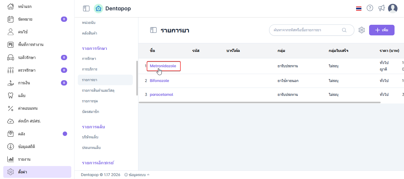 ผู้ใช้งานอยู่ในเมนูตั้งค่ารายการยา ให้ผู้ใช้งานคลิกเลือกยาที่ต้องการแก้ไข ระบบจะแสดงหน้าต่างข้อมูลรายการยาขึ้นมา