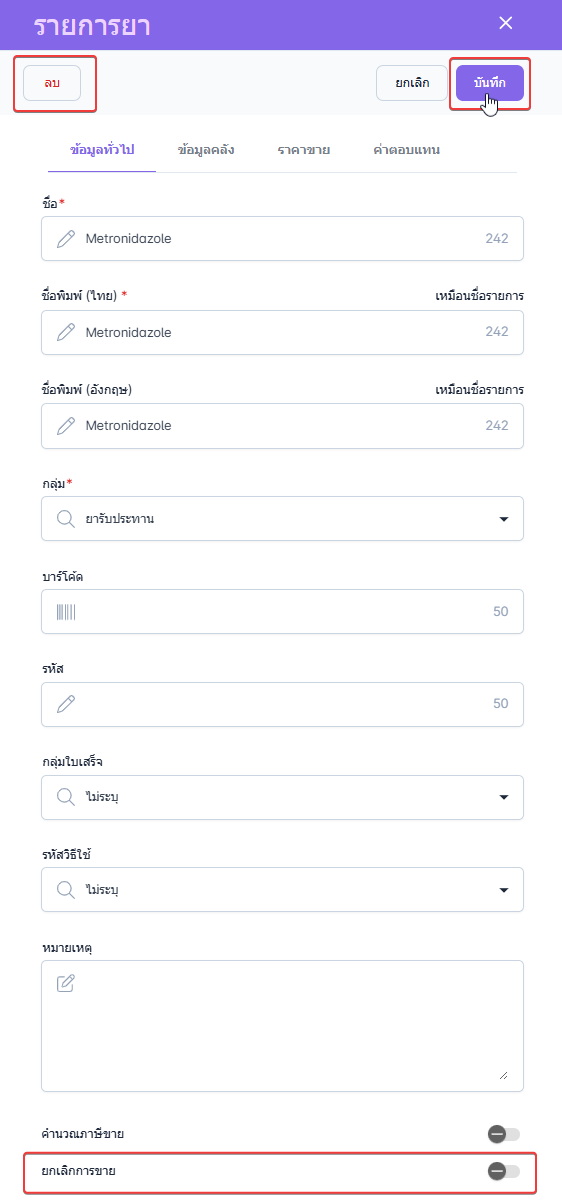 เมื่อแก้ไขข้อมูลเสร็จสิ้นคลิก บันทึก เพื่อบันทึกการแก้ไขรายการยา