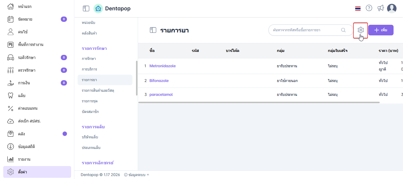 รายการยา เป็นส่วนหนึ่งของระบบที่ใช้สำหรับจัดการข้อมูลยาที่ใช้ภายในคลินิกทันตกรรม โดยผู้ใช้งานสามารถเพิ่ม แก้ไข และปรับปรุงข้อมูลรายการยาได้ตามความเหมาะสม เช่น ชื่อยา ประเภทยา