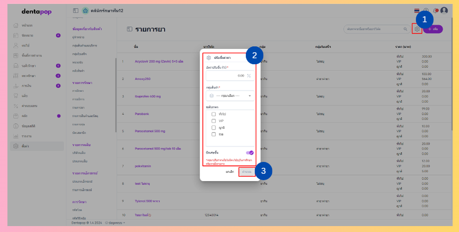 สามารถแก้ไขราคารายการยาได้ทั้งหมดทุกรายการ โดยอัตราปรับขึ้นเป็น %