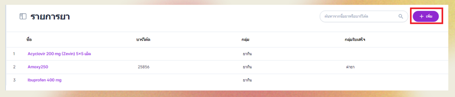 เมื่อผู้ใช้เข้าหน้ารายการยาแล้วคลิกปุ่มเพิ่ม