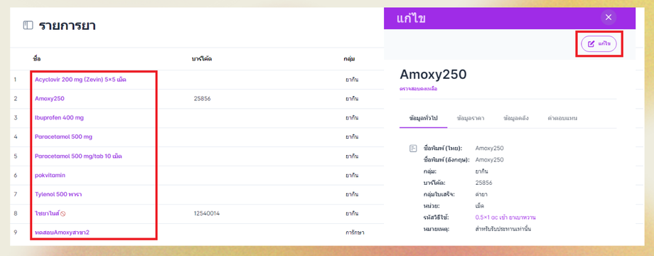 เมื่อผู้ใช้อยู่ในหน้ารายการยา เลือกรายการยาที่ต้องการแก้ไข > แก้ไข