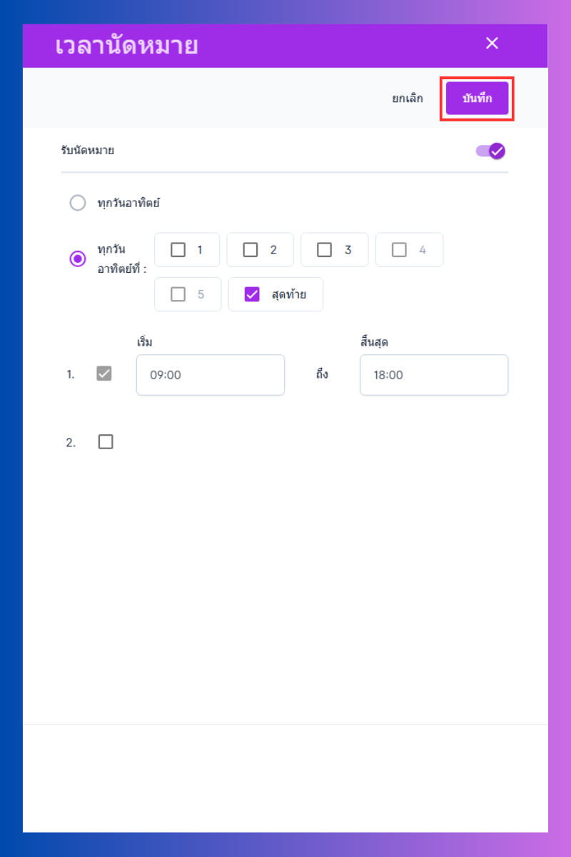 - ทุกวันอาทิตย์ที่: ระบบจะใช้การตั้งค่าเวลานัดหมายนี้ของแพทย์กับทุกวันอาทิตย์ที่ 2 และ 4 ของเดือน
