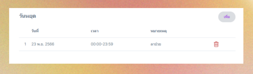 เมื่อทำการเพิ่มวันหยุด ในตารางนัดหมายจะไม่แสดงรายชื่อพนักงานที่มีวันหยุดตรงกับที่ผู้ใช้งานตั้งค่าไว้