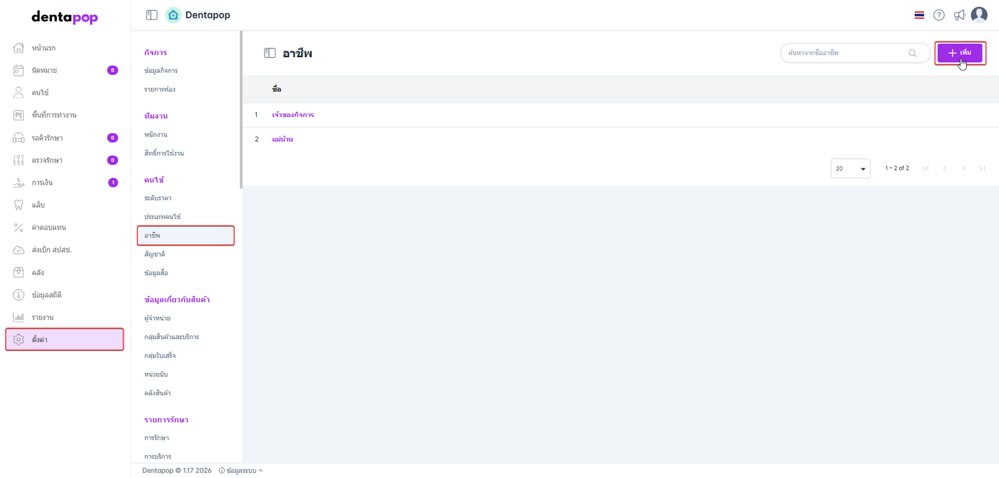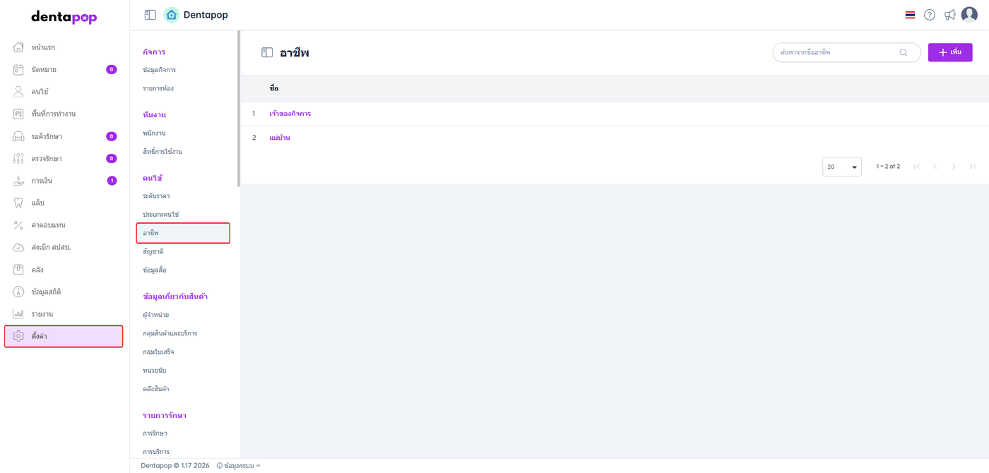 การตั้งค่าข้อมูลอาชีพเพื่อแบ่งอาชีพลูกค้าและจะแสดงการเลือกอาชีพในขั้นตอนการจัดการคนไข้ เพื่อเก็บข้อมูลทางการตลาด