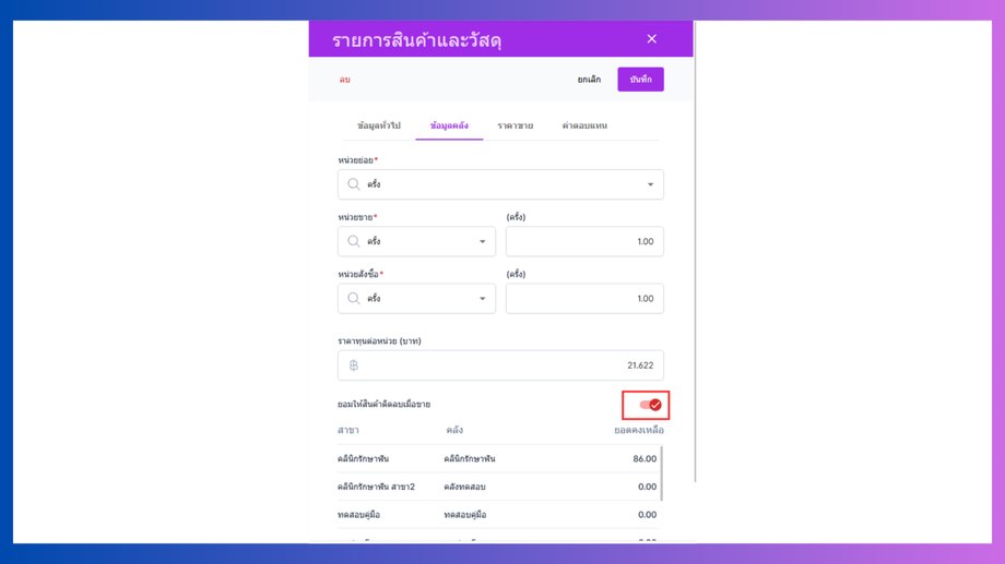 สามารถเปิด/ปิด ยอมให้สินค้าติดลบเมื่อขาย
