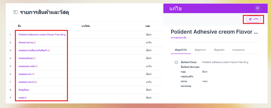 เมื่อผู้ใช้เข้าสู่หน้ารายการสินค้าและวัสดุเลือกรายการที่ต้องการแก้ไขจะมีหน้าต่างแสดงข้อมูลรายการ