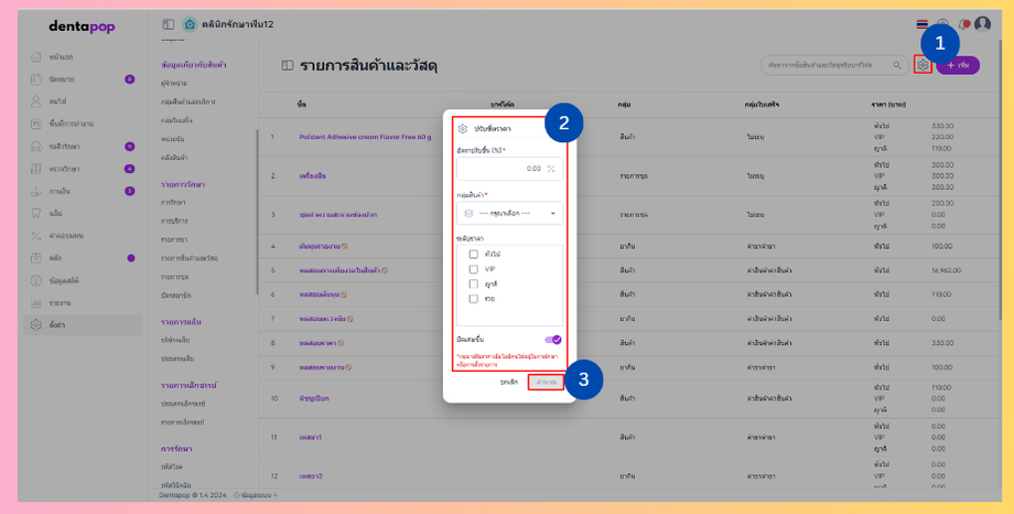 สามารถแก้ไขราคารายการสินค้าและวัสดุได้ทั้งหมดทุกรายการ โดยอัตราปรับขึ้นเป็น %