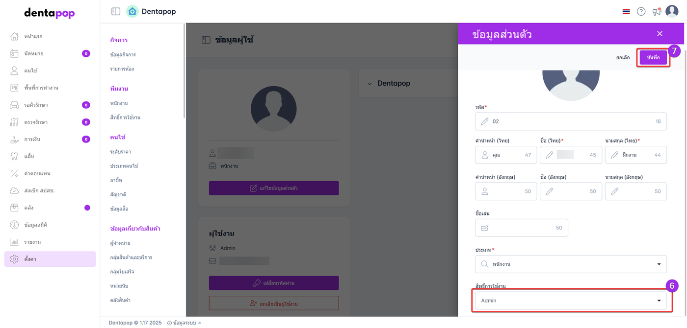 7.ผู้ใช้งานเลือกบันทึกเพื่อยืนยันข้อมูลการแก้ไขสิทธิ์การใช้งานของพนักงาน