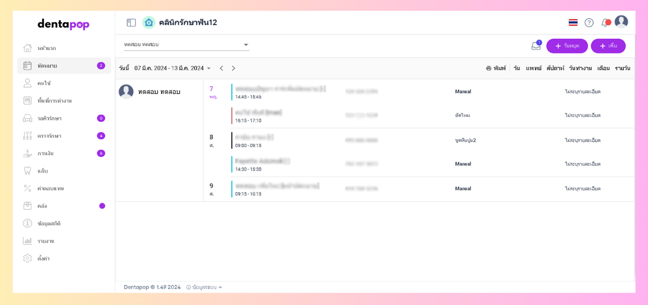 - เมื่อเปิดการใช้งานแล้วในหน้านัดหมายแพทย์ที่ล็อคอินเข้าใช้ระบบจะเห็นแค่นัดหมายของตัวเองเท่านั้น และไม่สามารถไปดูนัดหมายของแพทย์ท่านอื่นได้