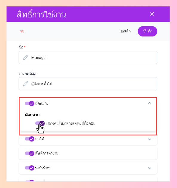 เมื่อผู้ใช้งานตั้งค่าสิทธิ์การใช้งานเรียบร้อย ผู้ใช้งานสามารถกำหนดให้กับพนักงานใช้สิทธิ์ต่างๆตามผู้ใช้งานตั้งค่าไว้ได้โดย