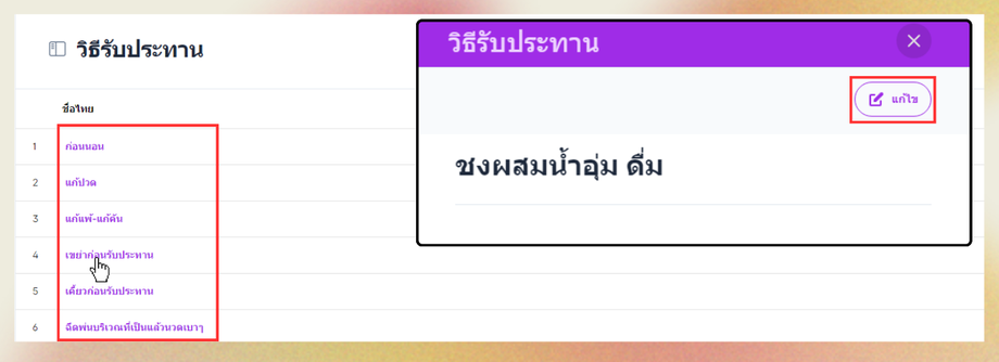 ผู้ใช้งานเลือกรายการวิธีรับประทานที่ต้องการแก้ไข ระบบจะแสดงหน้าต่างข้อมูล จากนั้นคลิกแก้ไข