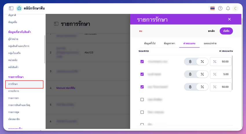 สามารถค้นหารายการค่ารักษาที่ต้องการให้ค่าตอบแทน โดยสามารถเลือกรายการทั้งหมดได้
