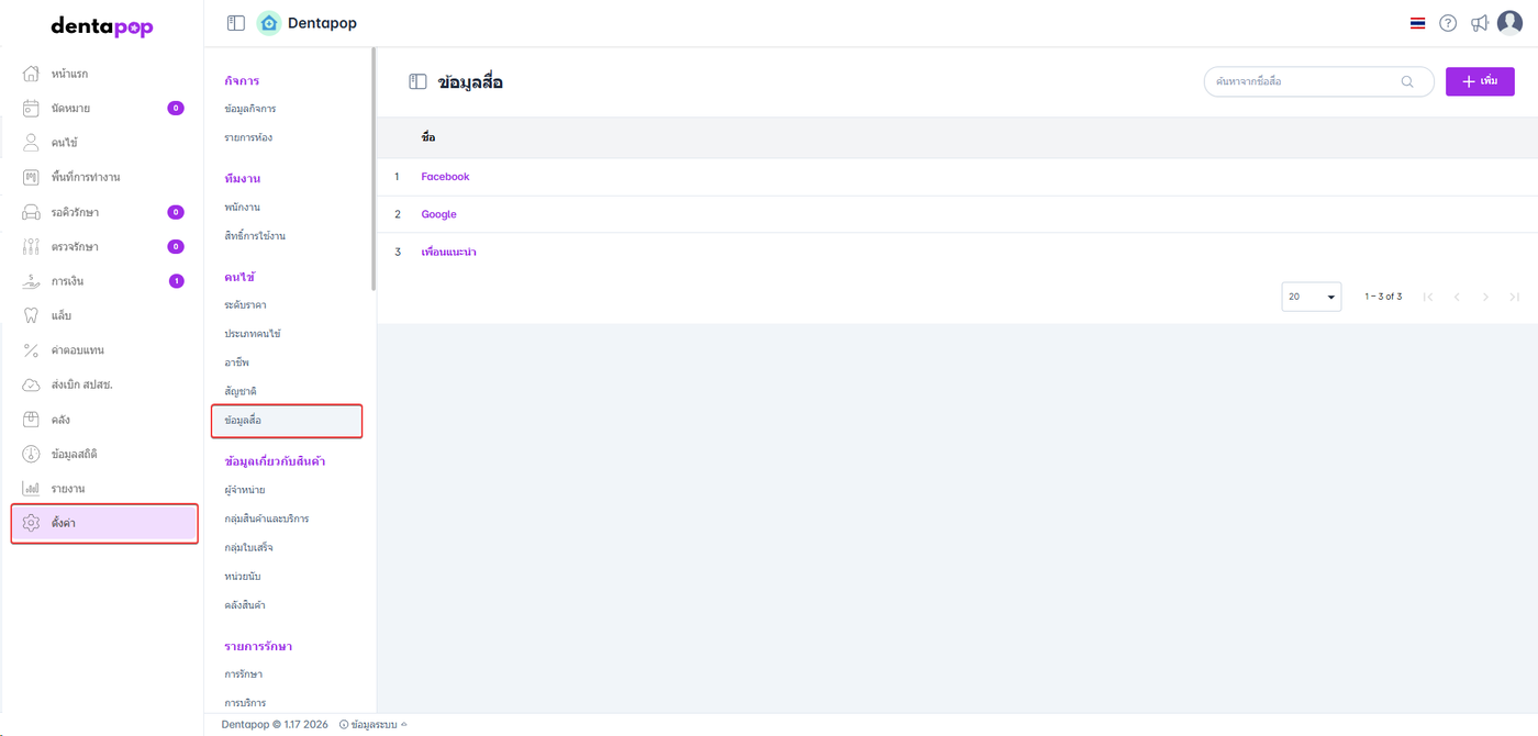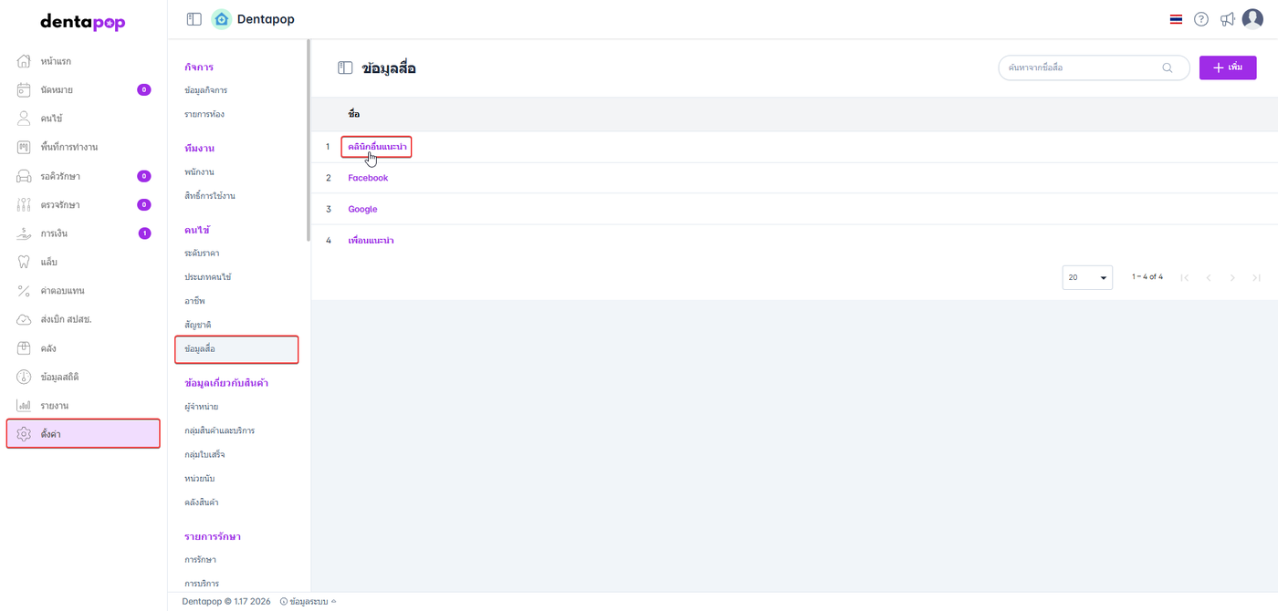 การตั้งค่าและเพิ่มรายการสื่อในระบบ เพื่อใช้ระบุช่องทางหรือแหล่งที่มาของคนไข้ รายการสื่อนี้จะแสดงเป็นตัวเลือกเมื่อบันทึกข้อมูลคนไข้ ช่วยให้การเก็บข้อมูลสื่อครบถ้วนและนำไปใช้วิเคราะห์ผลการสื่อสารการตลาดได้อย่างมีประสิทธิภาพ