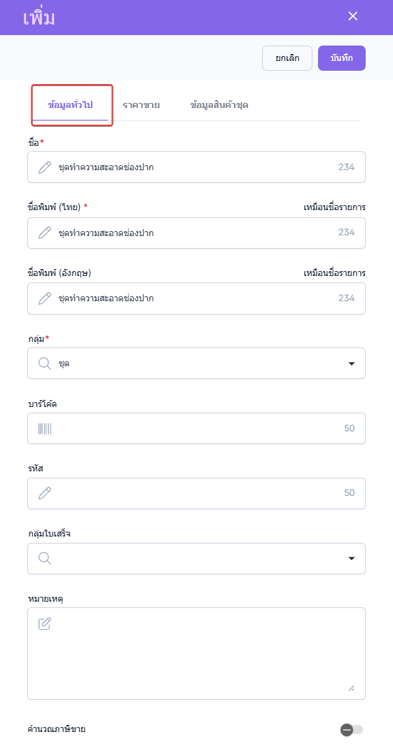 ชื่อพิมพ์ไทย : ชื่อรายการชุดที่จะแสดงในการพิมพ์ ภาษาไทย เช่น ใบเสร็จ ใบรับรองแพทย์ ฉลากยา