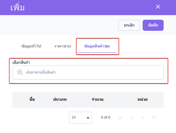เมื่อผู้ใช้งานเลือกรายการสินค้า ระบบจะให้ผู้ใช้งานกรอกจำนวนสินค้าที่ต้องการให้อยู่ในรายการชุด