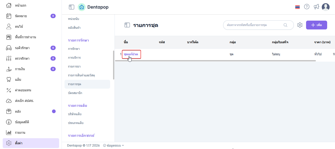 ผู้ใช้งานอยู่ในเมนูตั้งค่ารายการชุด ให้ผู้ใช้งานคลิกเลือกรายการชุดที่ต้องการแก้ไข ระบบจะแสดงหน้าต่างข้อมูลรายการชุดขึ้นมา